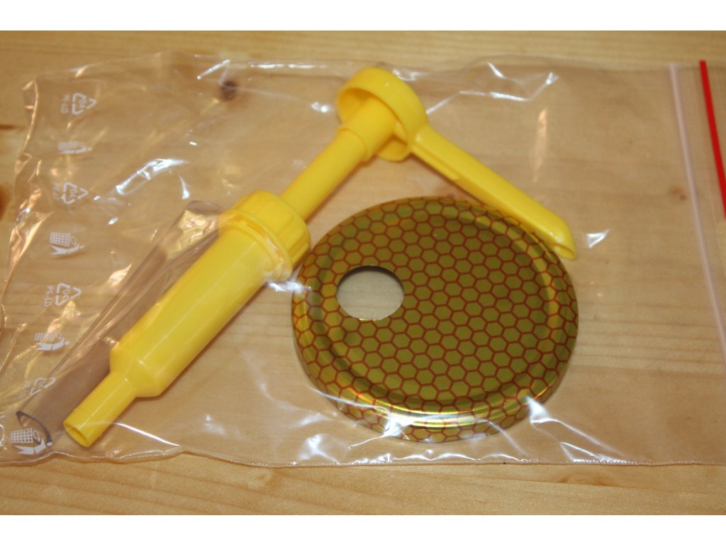 Dávkovač tekutého medu. Dodáva sa s kovovým viečkom s priemerom 82 mm, ktoré možno naskrutkovať na poháre twist s objemom 0,7l.