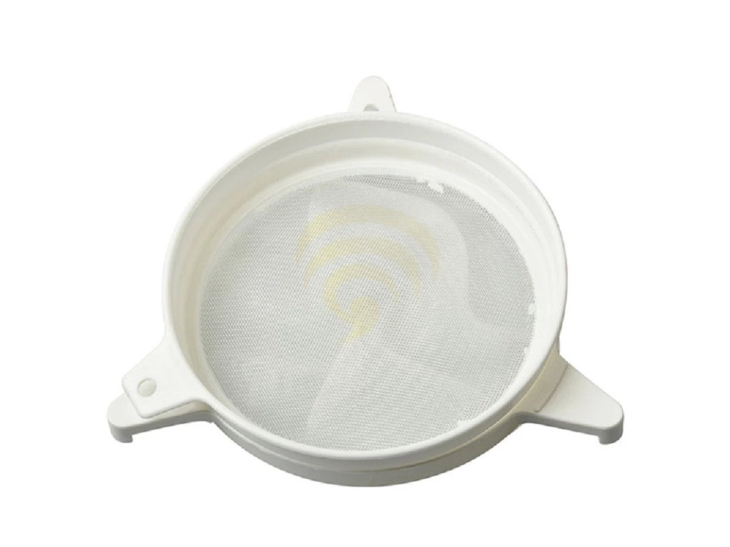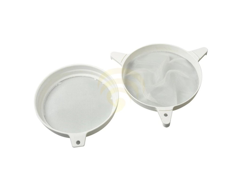 Dvojité plastové sito s priemerom 23 cm a závesnými hákmi.